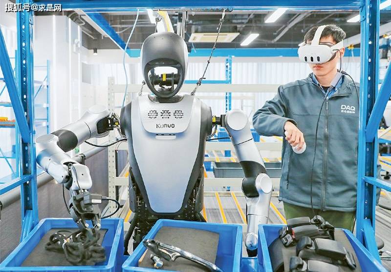 依托我国开源市场的发展路径,AI+技术可以快速赋能制造工厂,人工智能溢出效应显著。在山东省青岛市崂山区的人形机器人数据采集训练场,机器人通过与环境物理交互,快速学习快递分拣、理货等实用技能。该训练场旨在通过大量场景模拟与实时数据采集,实现机器人的自主学习和性能优化,标志着人形机器人在实际应用技能训练方面迈出关键一步。图为2026年1月12日,该训练场的数据采集人员正在指导机器人进行精细化技能学习。 中新社发 张进刚/摄